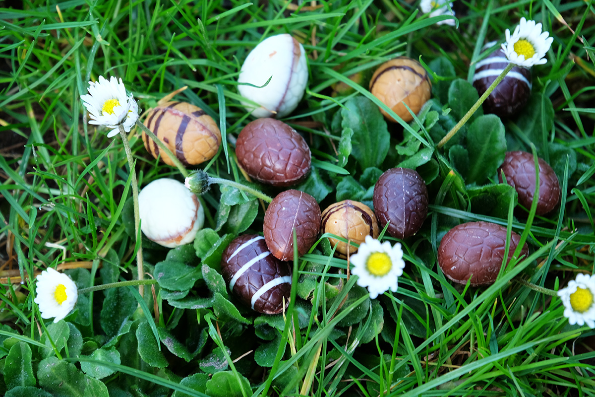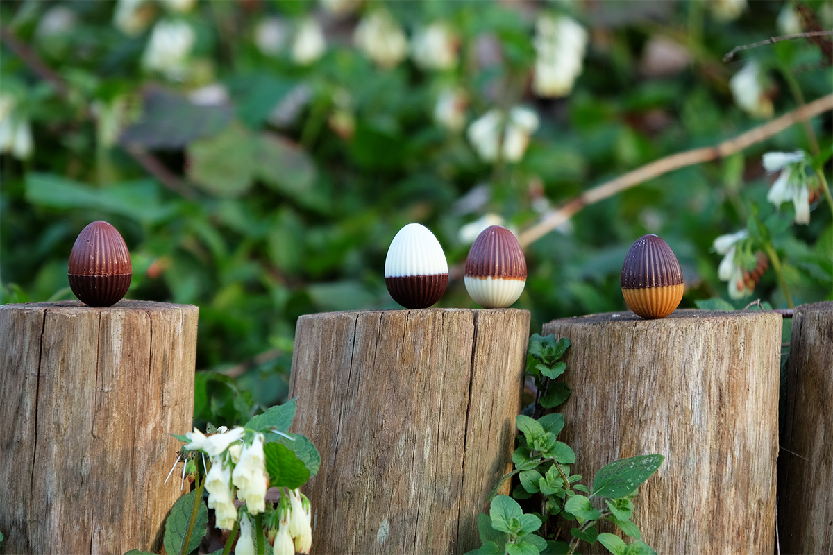 Assortiment d’œufs fourrés au praliné en partie haute et une partie basse au chocolat fourrée aux fruits.Les deux frères Bomma Flora séparés par l’Atlantique, réunis par le chocolat !