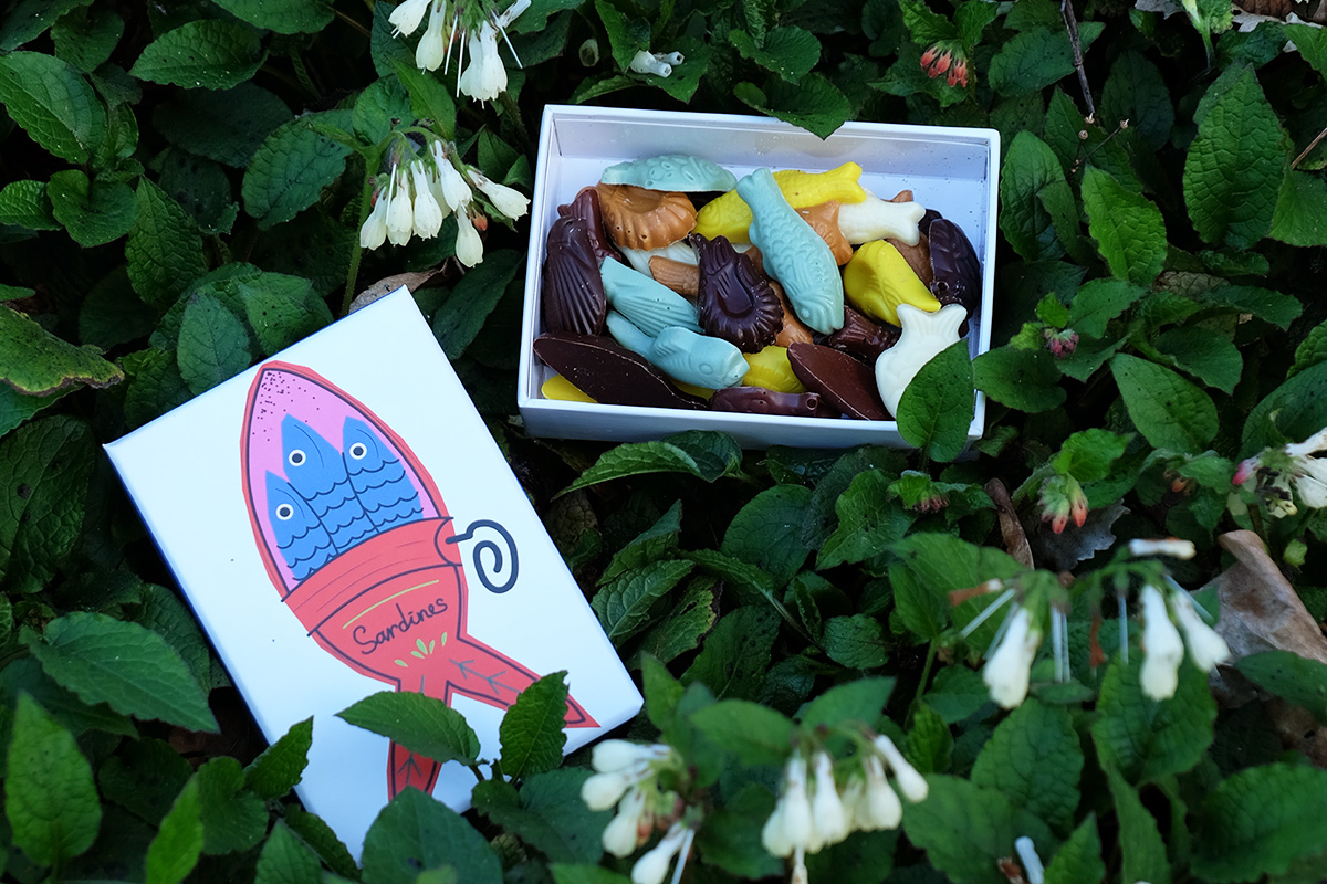 Assortiment de fritures de Pâques aux chocolats infusés aux plantes en forme de poissons, de gambas, de coquillages...Oeufs de caille – sachet 120g